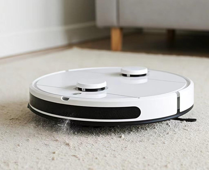 一台扫地机器人从基站中缓缓驶出,滚刷轻拂地面,所经之处的污渍瞬间消失......